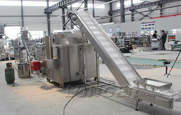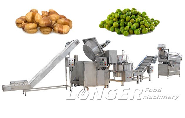 The broad bean frying machine is an automatic frying production line, including a deep fryer, a de-oiling machine and a seasoning machine. This fryer machine is suitable for frying green peas, broad beans, peanuts, soybeans, chickpeas, etc. Gas heating type, high thermal efficiency, high quality and consistent fried food.